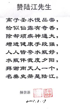 3. 詳細了解請上網,可見臨床報告,鑒定證書、專家評說、治病機理、用戶反饋、題詞、詩歌、錦旗等彩色掃描件,被譽為"神奇水瓶"。