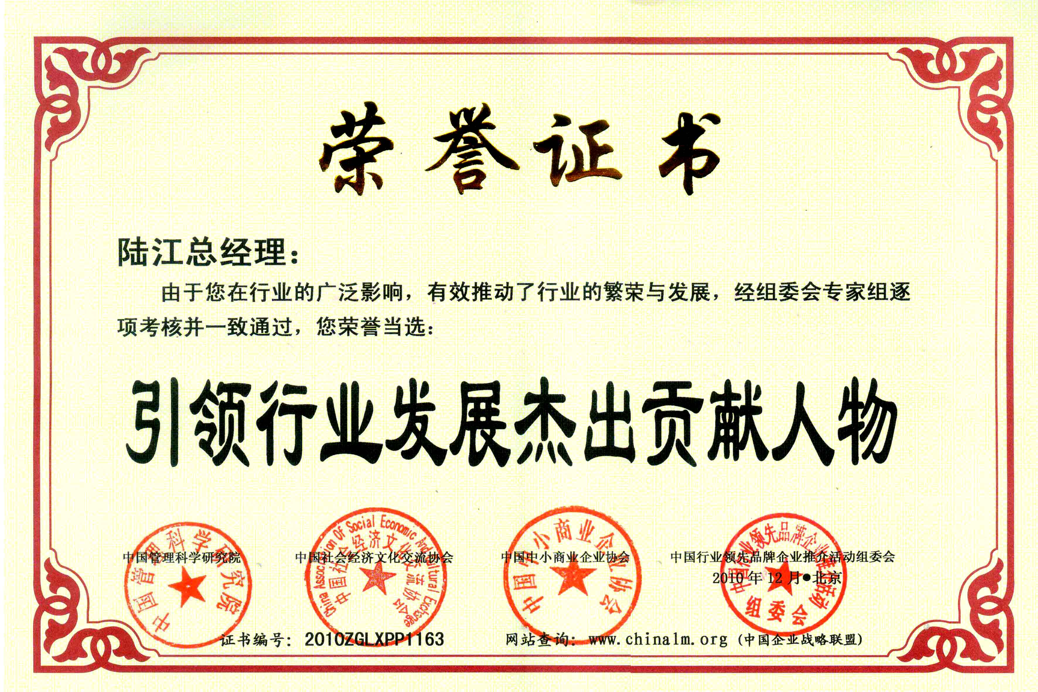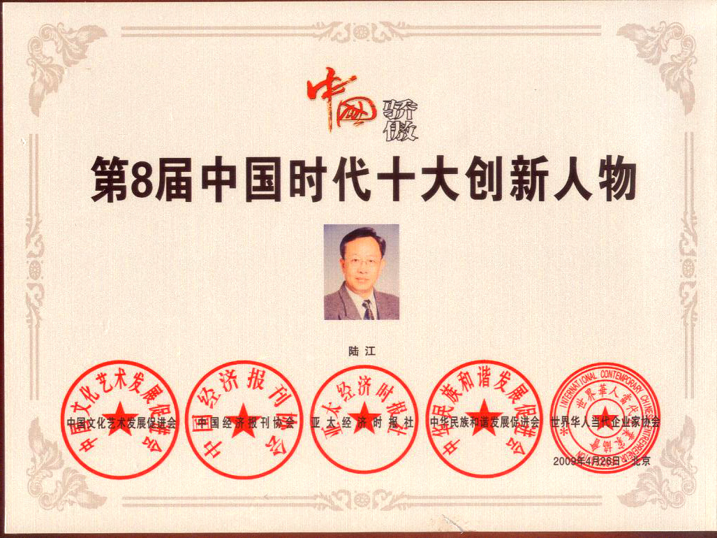 陸江榮獲引領行業發展杰出貢獻人物證書 --------卓康公司榮獲全國質量、服務、信譽AAA級品牌證書